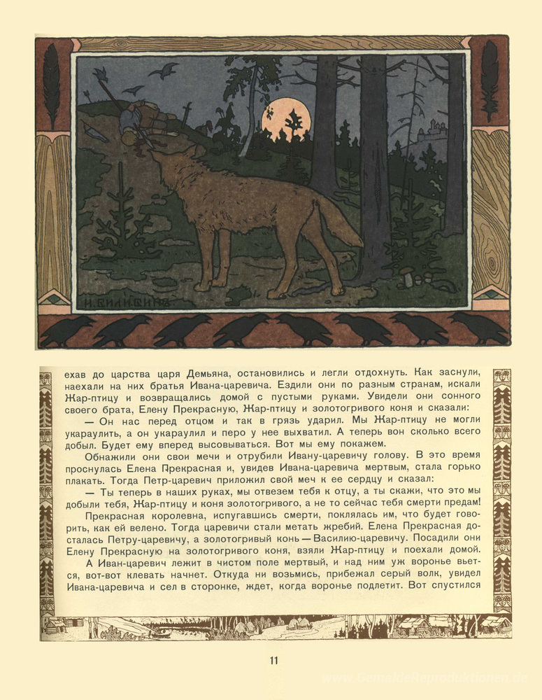 Wir bieten Ihnen eine handgefertigte Reproduktion auf Leinwand des berühmten Kunstwerks 'Illustration für die Geschichte von Prinz Iwan, Der Feuervogel u' von Ivan Bilibin, aus dem Reproduktionsmuseum.