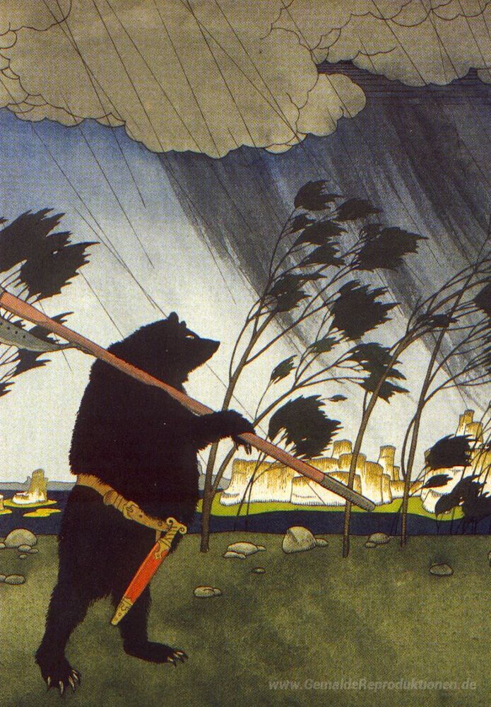Wir bieten Ihnen eine handgefertigte Reproduktion auf Leinwand des berühmten Kunstwerks 'Illustration. Märchen: Teremok. Mizgir '.' von Heorhiy Narbut, aus dem Reproduktionsmuseum.