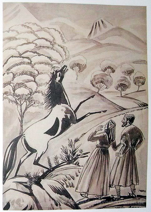 Wir bieten Ihnen eine handgefertigte Reproduktion auf Leinwand des berühmten Kunstwerks 'Illustration zu "armenischen Volksmärchen"' von Martiros Saryan, aus dem Reproduktionsmuseum.