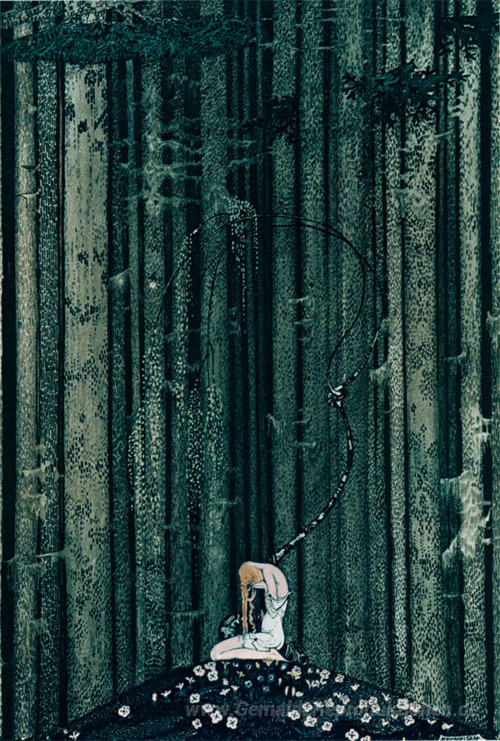 Wir bieten Ihnen eine handgefertigte Reproduktion auf Leinwand des berühmten Kunstwerks 'In der Mitte der Gloomy dickem Holz' von Kay Nielsen, aus dem Reproduktionsmuseum.