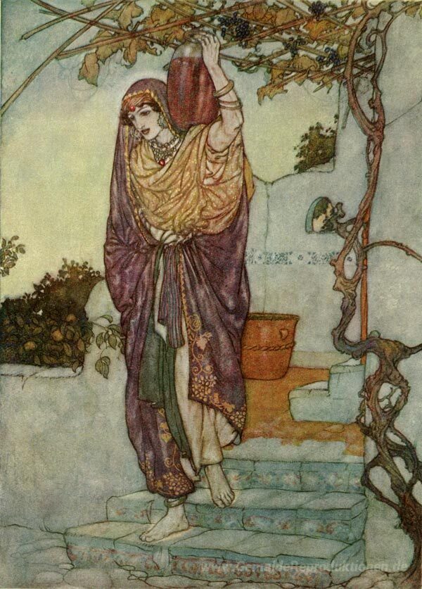 Wir bieten Ihnen eine handgefertigte Reproduktion auf Leinwand des berühmten Kunstwerks 'Kam scheint durch die Abenddämmerung ein Engels-Form, Die Rubaiy' von Edmund Dulac, aus dem Reproduktionsmuseum.