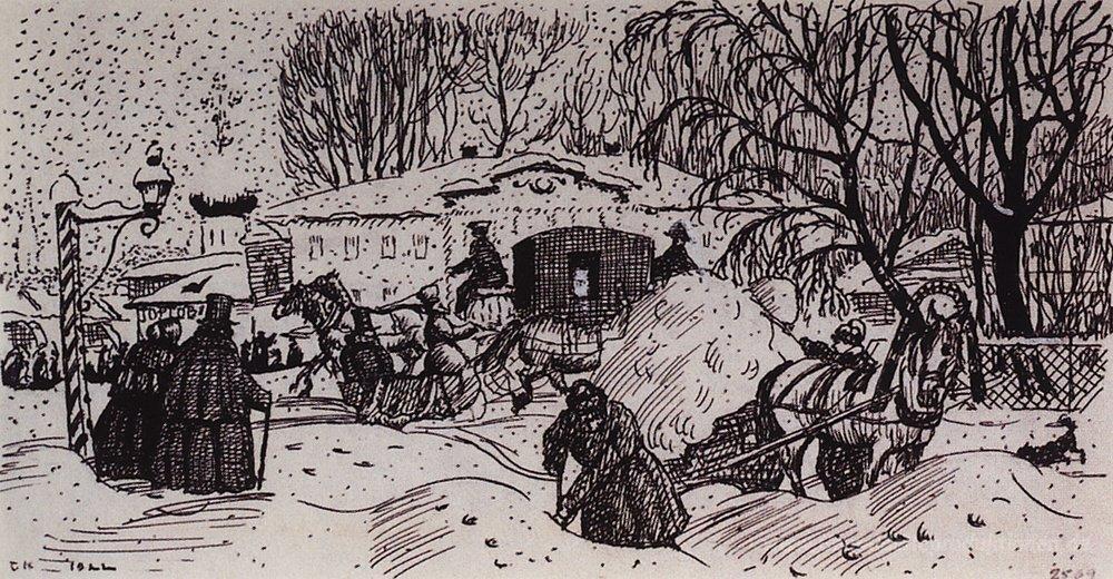 Wir bieten Ihnen eine handgefertigte Reproduktion auf Leinwand des berühmten Kunstwerks 'Kopfstück (Winter-Straße)' von Boris Kustodiev, aus dem Reproduktionsmuseum.