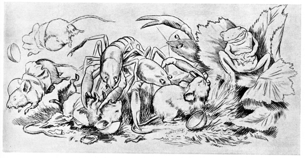 Wir bieten Ihnen eine handgefertigte Reproduktion auf Leinwand des berühmten Kunstwerks 'Krigen Mellom Froskene Og Musene 13' von Theodor Severin Kittelsen, aus dem Reproduktionsmuseum.