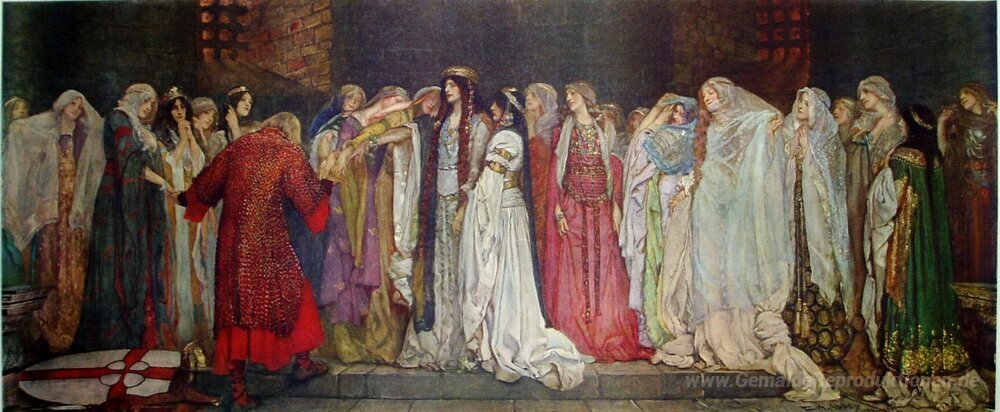 Wir bieten Ihnen eine handgefertigte Reproduktion auf Leinwand des berühmten Kunstwerks 'Le château des servantes' von Edwin Austin Abbey, aus dem Reproduktionsmuseum.