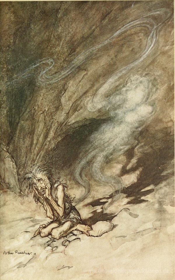 Wir bieten Ihnen eine handgefertigte Reproduktion auf Leinwand des berühmten Kunstwerks 'Mime windet sich unter den Peitschenhieben erhält er' von Arthur Rackham, aus dem Reproduktionsmuseum.