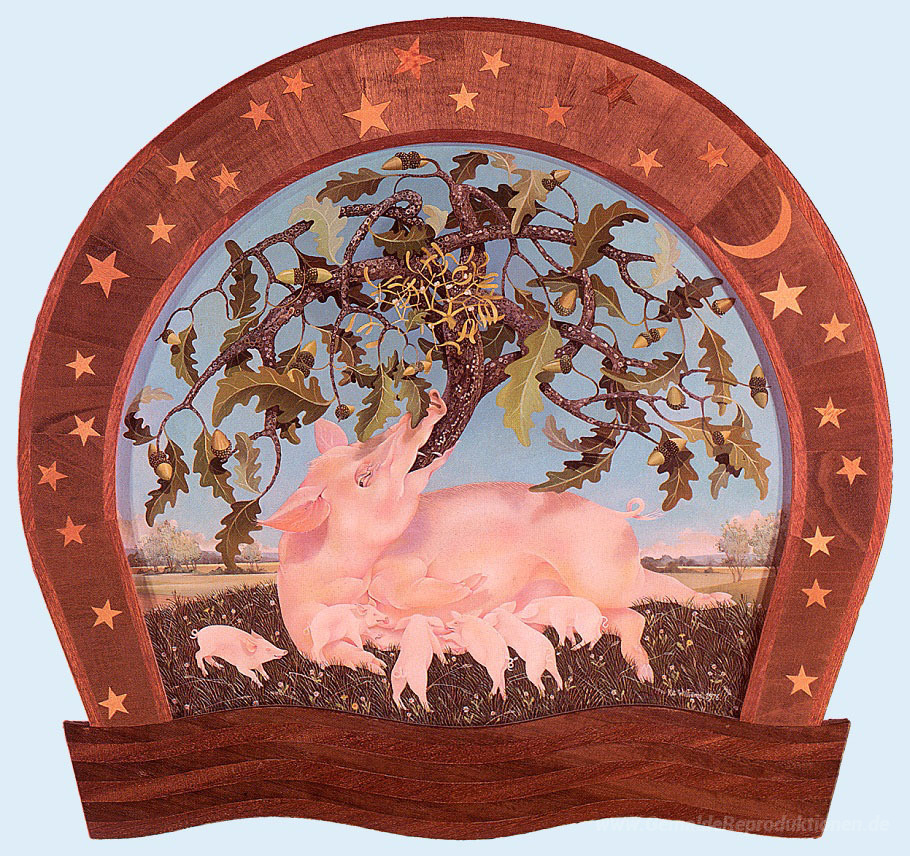 Wir bieten Ihnen eine handgefertigte Reproduktion auf Leinwand des berühmten Kunstwerks 'Mistle Oak' von Kit Williams, aus dem Reproduktionsmuseum.