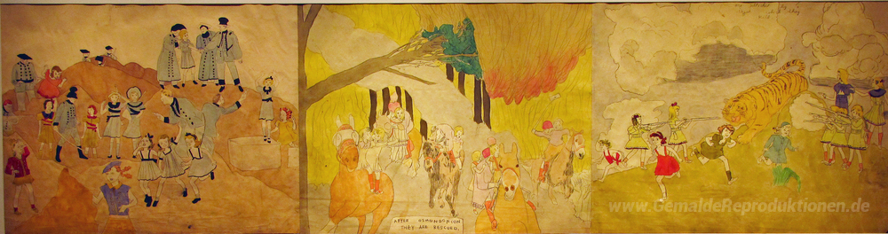Wir bieten Ihnen eine handgefertigte Reproduktion auf Leinwand des berühmten Kunstwerks 'Nach Osmondonson sie gerettet werden' von Henry Darger, aus dem Reproduktionsmuseum.