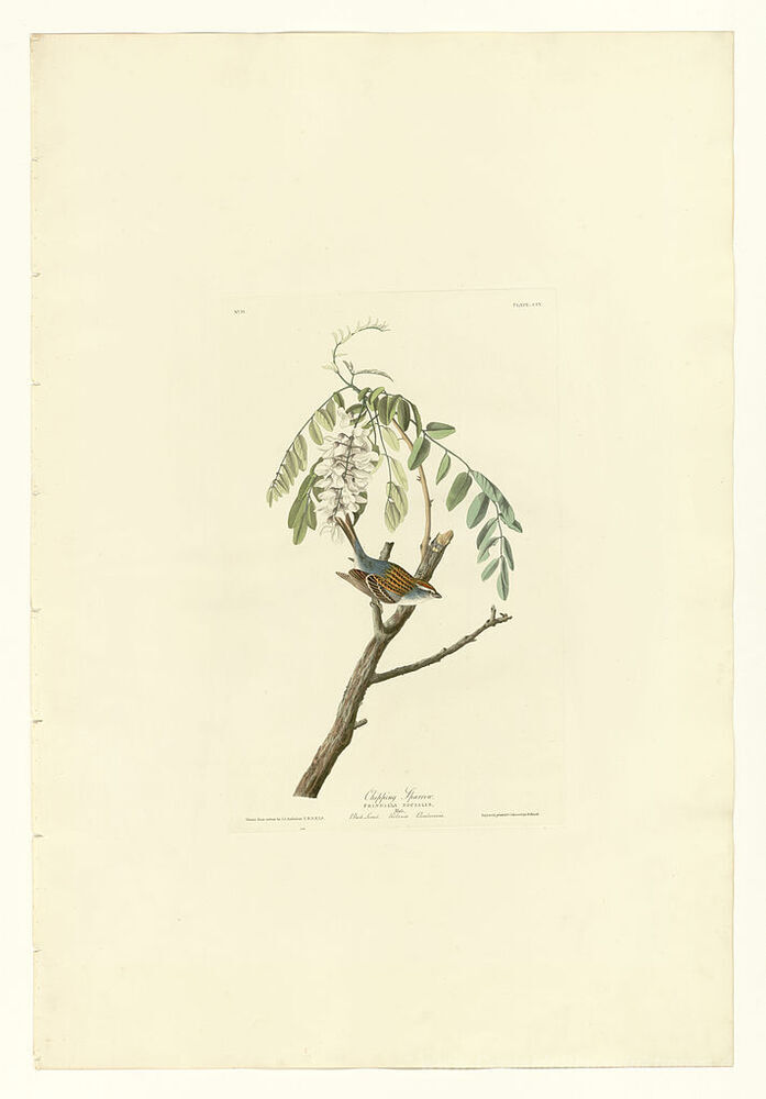 Wir bieten Ihnen eine handgefertigte Reproduktion auf Leinwand des berühmten Kunstwerks 'Platte 104 Chipping Sparrow' von John James Audubon, aus dem Reproduktionsmuseum.