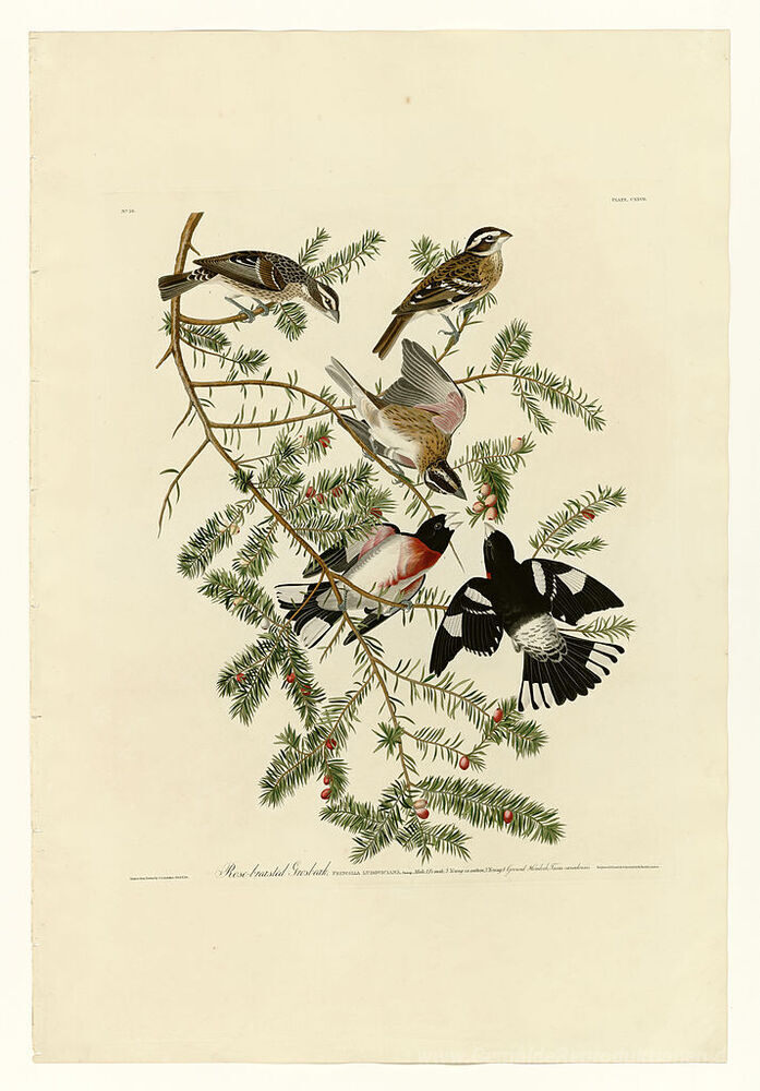 Wir bieten Ihnen eine handgefertigte Reproduktion auf Leinwand des berühmten Kunstwerks 'Platte 127 Rose-breasted Grosbeak' von John James Audubon, aus dem Reproduktionsmuseum.