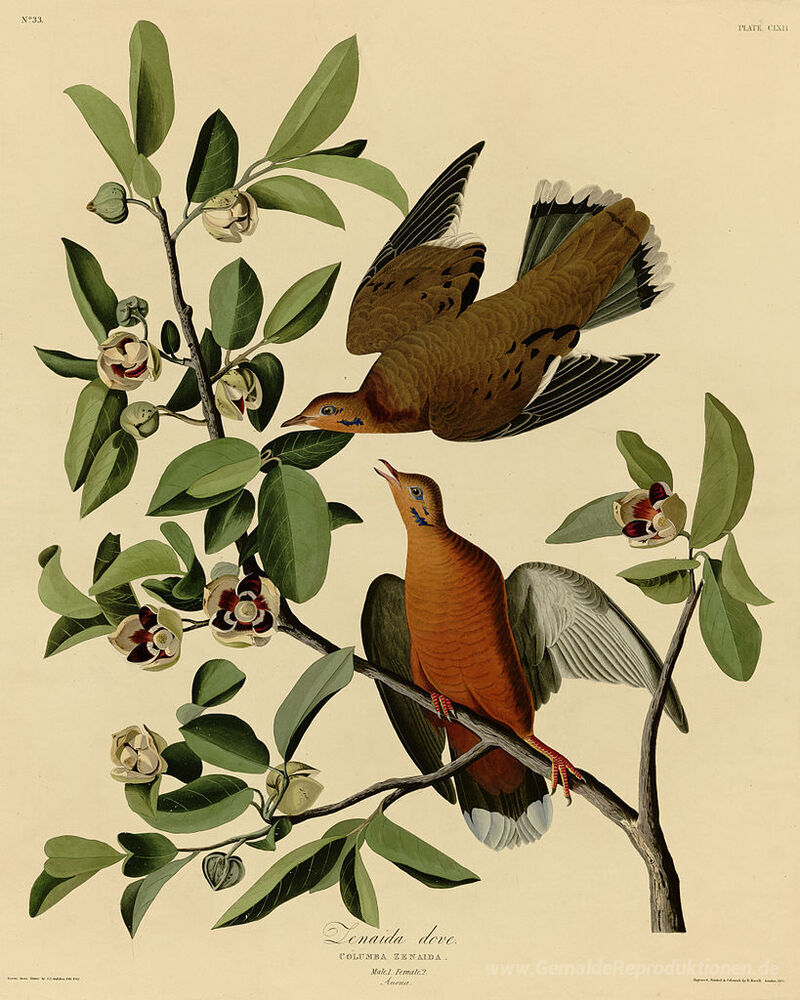 Wir bieten Ihnen eine handgefertigte Reproduktion auf Leinwand des berühmten Kunstwerks 'Platte 162 Zenaida Dove' von John James Audubon, aus dem Reproduktionsmuseum.