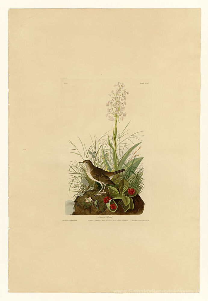 Wir bieten Ihnen eine handgefertigte Reproduktion auf Leinwand des berühmten Kunstwerks 'Platte 164 Tawny Thrush' von John James Audubon, aus dem Reproduktionsmuseum.