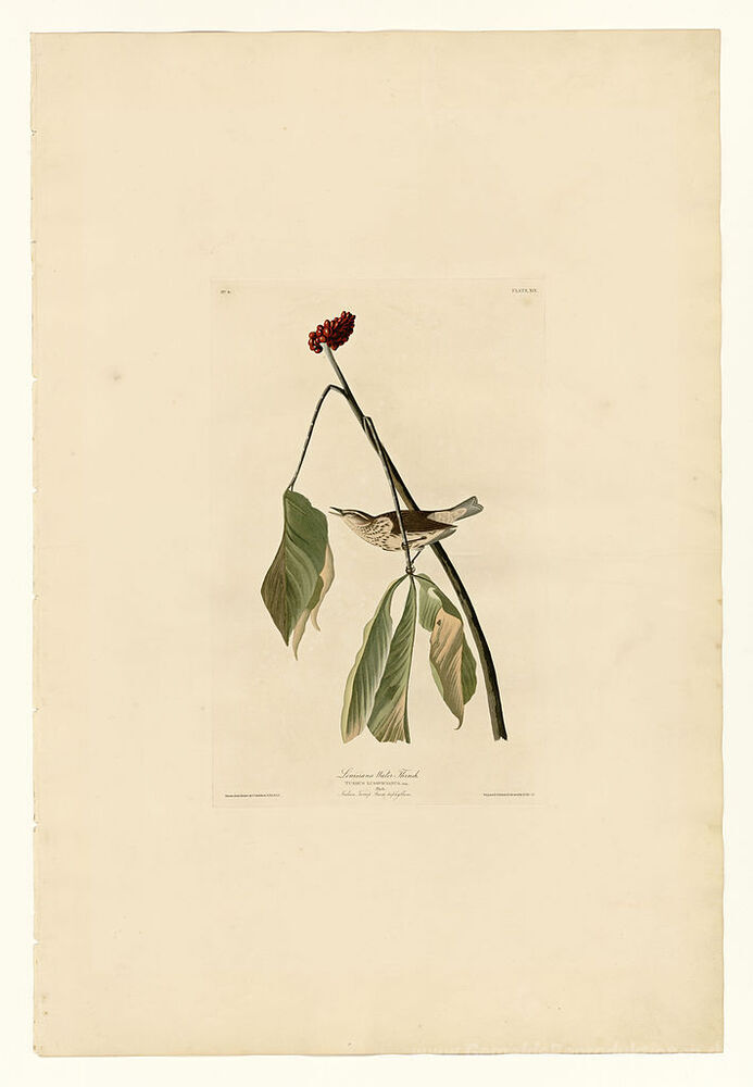 Wir bieten Ihnen eine handgefertigte Reproduktion auf Leinwand des berühmten Kunstwerks 'Platte 19 Louisiana Wasser Thrush' von John James Audubon, aus dem Reproduktionsmuseum.