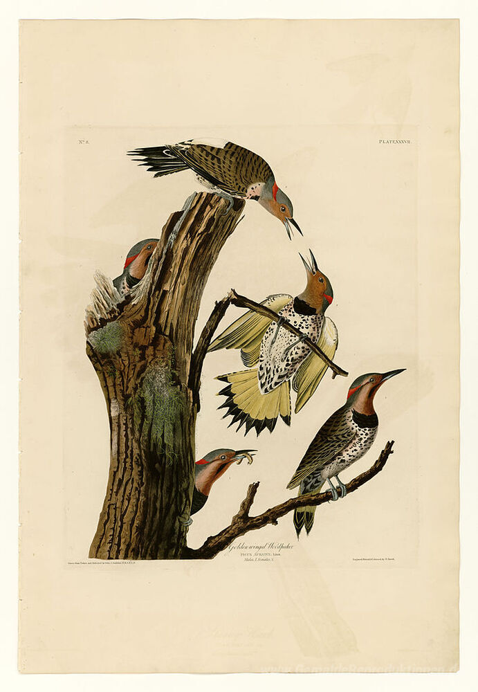 Willkommen in unserer ausgewählten Kollektion von Ölgemälden, in der Kunstwerke lebendig werden und jeden Raum in eine Oase der Inspiration verwandeln. Eines der herausragenden Stücke ist Platte 37 Golden-winged Woodpecker von dem legendären Naturforscher und Maler John James Audubon. Audubon, bekannt für seine detailgetreue Darstellung der amerikanischen Vogelwelt, setzt mit seiner Technik und seinem einzigartigen Stil Maßstäbe in der ornithologischen Kunst.