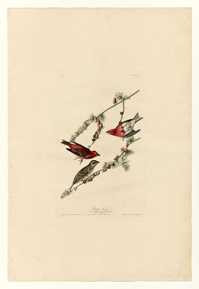 Wir bieten Ihnen eine handgefertigte Reproduktion auf Leinwand des berühmten Kunstwerks 'Platte 4 lila Fink' von John James Audubon, aus dem Reproduktionsmuseum.