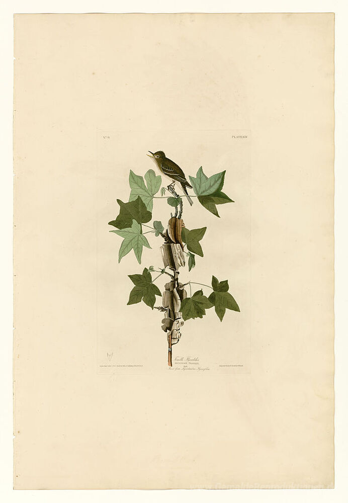 Wir bieten Ihnen eine handgefertigte Reproduktion auf Leinwand des berühmten Kunstwerks 'Platte 45 Traills Flycatcher' von John James Audubon, aus dem Reproduktionsmuseum.