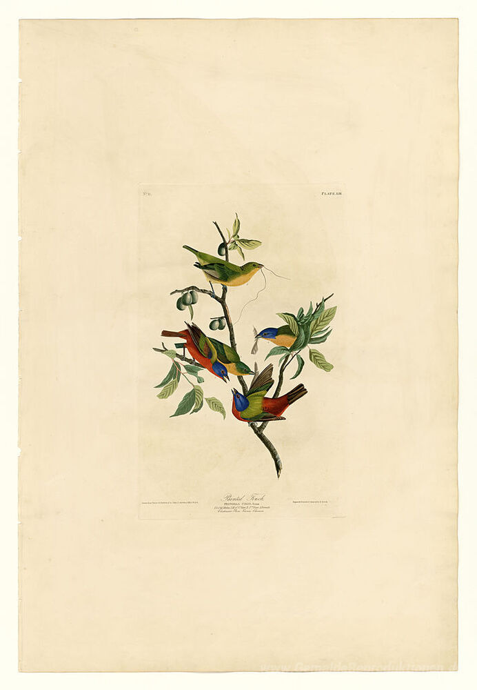 Wir bieten Ihnen eine handgefertigte Reproduktion auf Leinwand des berühmten Kunstwerks 'Platte 53 Painted Finch' von John James Audubon, aus dem Reproduktionsmuseum.