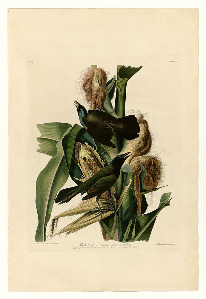 Willkommen in unserer exquisiten Sammlung von Ölgemälden, die die Schönheit und Faszination der Natur in einzigartiger Weise festhalten. Eines der herausragenden Werke ist Platte 7 Lila Grakle oder Common Crow Blackbird, geschaffen von dem renommierten Künstler John James Audubon. Audubon, bekannt für seine detailreichen Darstellungen der amerikanischen Vogelwelt, verbindet meisterhaft Präzision mit künstlerischem Ausdruck.