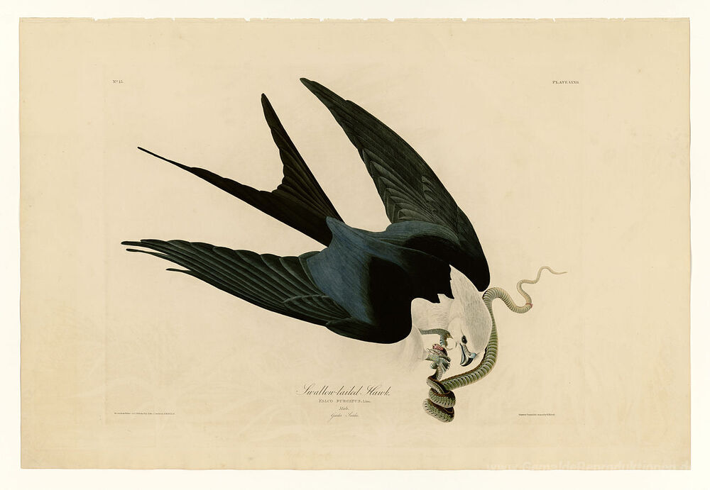 Wir bieten Ihnen eine handgefertigte Reproduktion auf Leinwand des berühmten Kunstwerks 'Platte 72 Swallow-tailed Hawk' von John James Audubon, aus dem Reproduktionsmuseum.