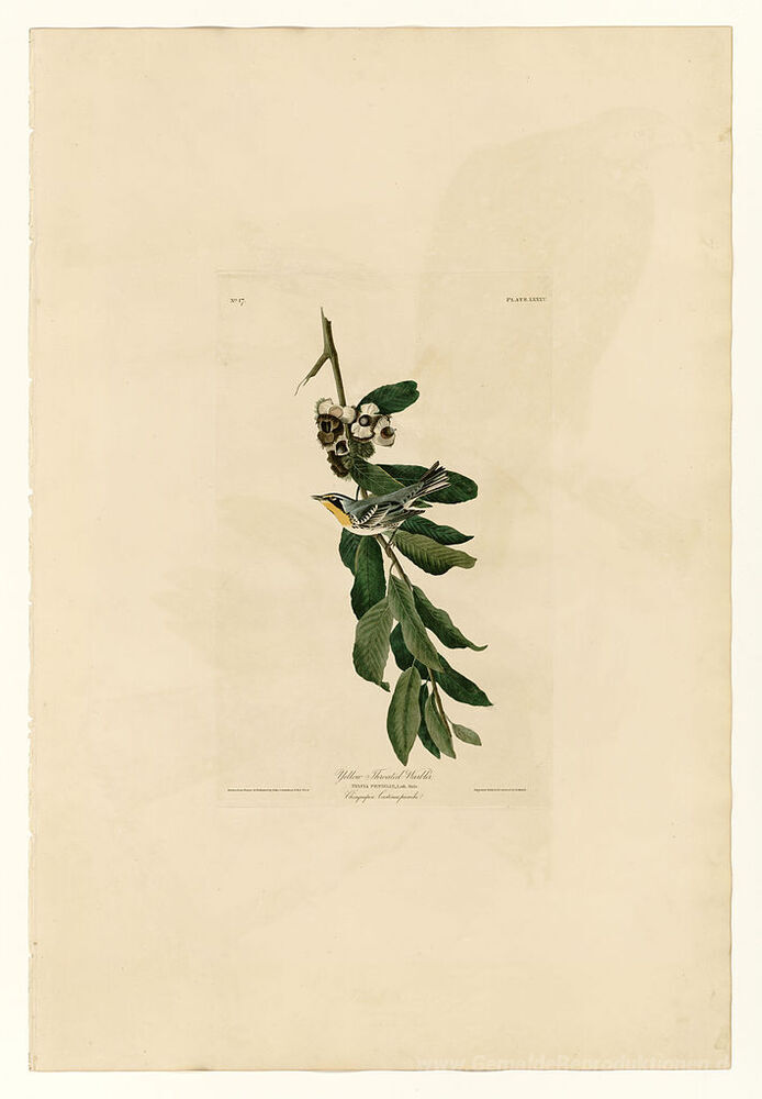 Wir bieten Ihnen eine handgefertigte Reproduktion auf Leinwand des berühmten Kunstwerks 'Platte 85 Gelb Throated Trällerer' von John James Audubon, aus dem Reproduktionsmuseum.