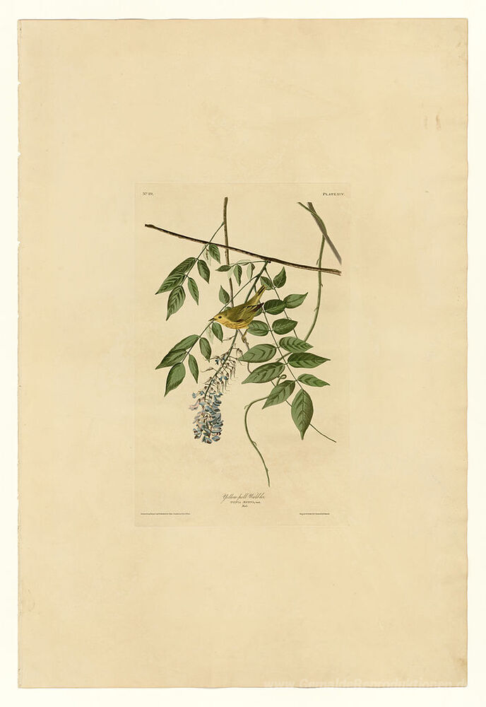 Wir bieten Ihnen eine handgefertigte Reproduktion auf Leinwand des berühmten Kunstwerks 'Platte 95 Yellow-Umfrage Warbler' von John James Audubon, aus dem Reproduktionsmuseum.