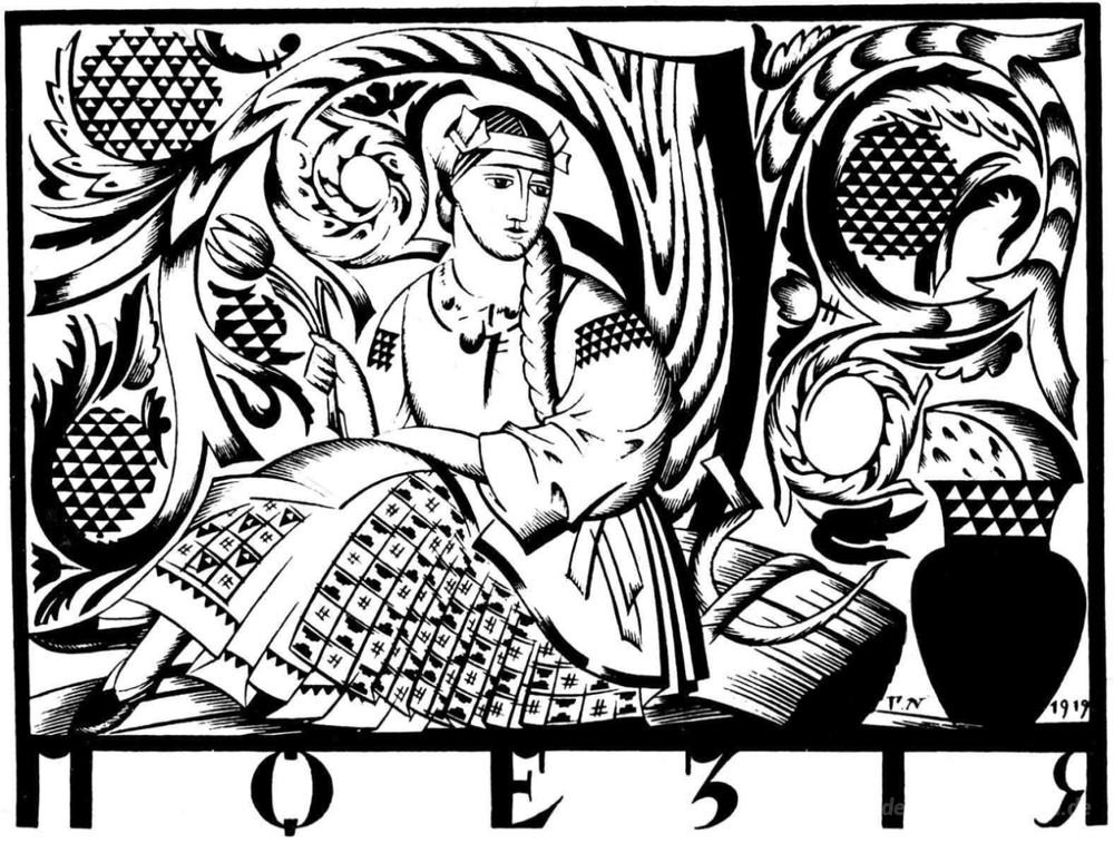 Wir bieten Ihnen eine handgefertigte Reproduktion auf Leinwand des berühmten Kunstwerks 'Poesie. Kopfschmuck, um Magazin 'Kunst'.' von Heorhiy Narbut, aus dem Reproduktionsmuseum.