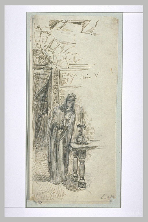 Wir bieten Ihnen eine handgefertigte Reproduktion auf Leinwand des berühmten Kunstwerks 'Projet d'illustration gießen Macbeth-8' von Luc-Olivier Merson, aus dem Reproduktionsmuseum.