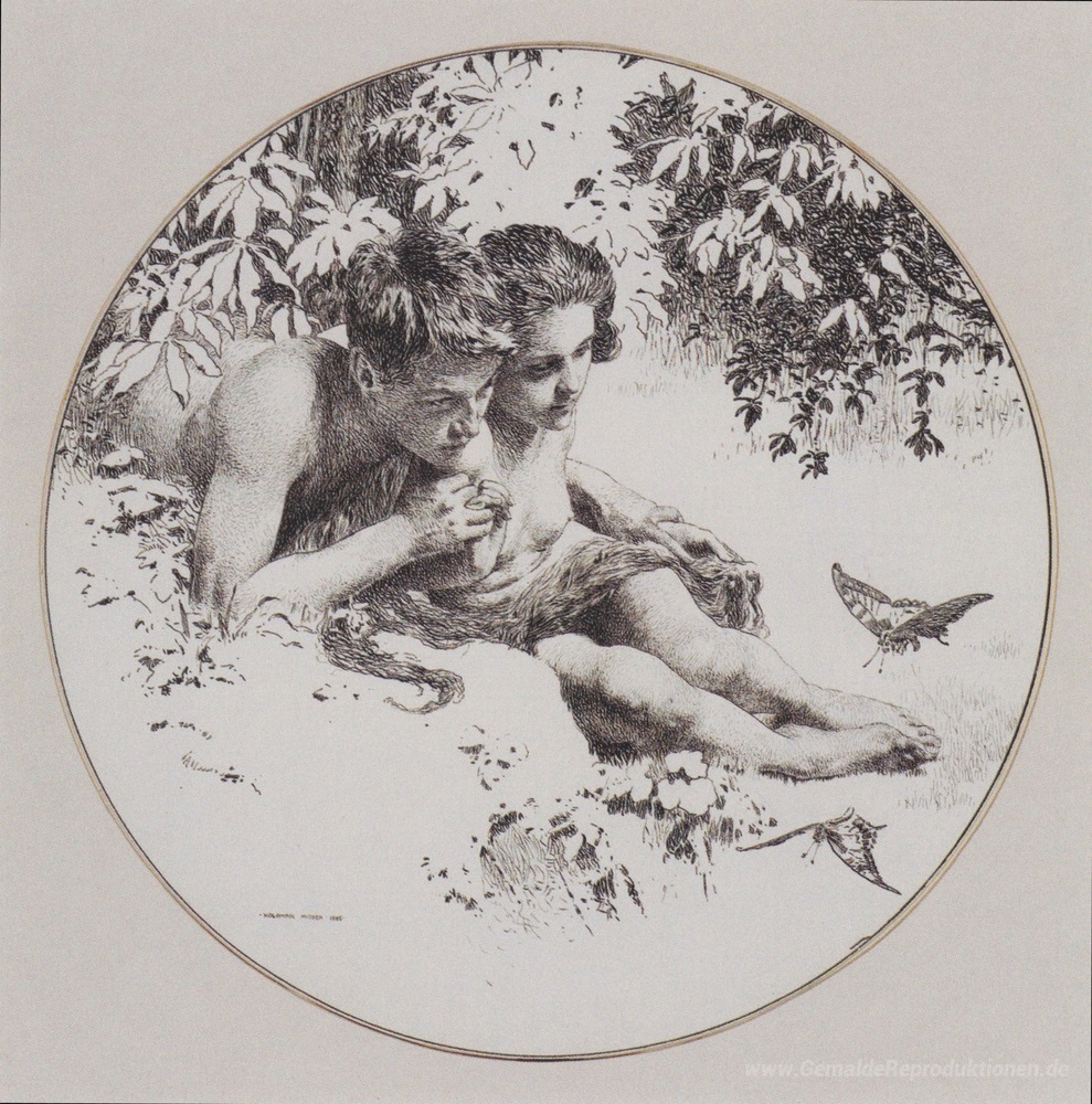 Wir bieten Ihnen eine handgefertigte Reproduktion auf Leinwand des berühmten Kunstwerks 'Reproduktionsvorlage für den mittleren Teil des Blattes Liebe fü' von Koloman Moser, aus dem Reproduktionsmuseum.
