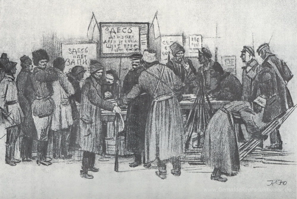 Wir bieten Ihnen eine handgefertigte Reproduktion auf Leinwand des berühmten Kunstwerks 'Revolutionäre Hauptquartier der Krasnaja Presnja' von Konstantin Yuon, aus dem Reproduktionsmuseum.