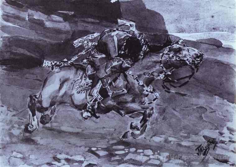 Wir bieten Ihnen eine handgefertigte Reproduktion auf Leinwand des berühmten Kunstwerks 'Rider ("durch Pferd schneller von Damhirsch ...")' von Mikhail Vrubel, aus dem Reproduktionsmuseum.