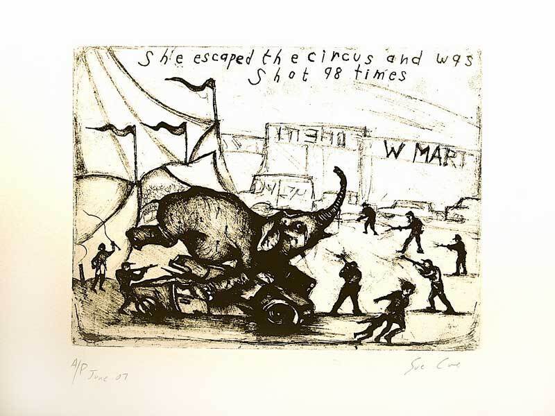 Wir bieten Ihnen eine handgefertigte Reproduktion auf Leinwand des berühmten Kunstwerks 'Sie entkam Zirkus' von Sue Coe, aus dem Reproduktionsmuseum.