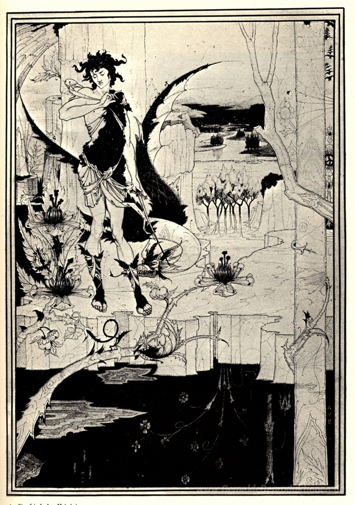 Wir bieten Ihnen eine handgefertigte Reproduktion auf Leinwand des berühmten Kunstwerks 'Siegfried Illustration, Akt II' von Aubrey Beardsley, aus dem Reproduktionsmuseum.