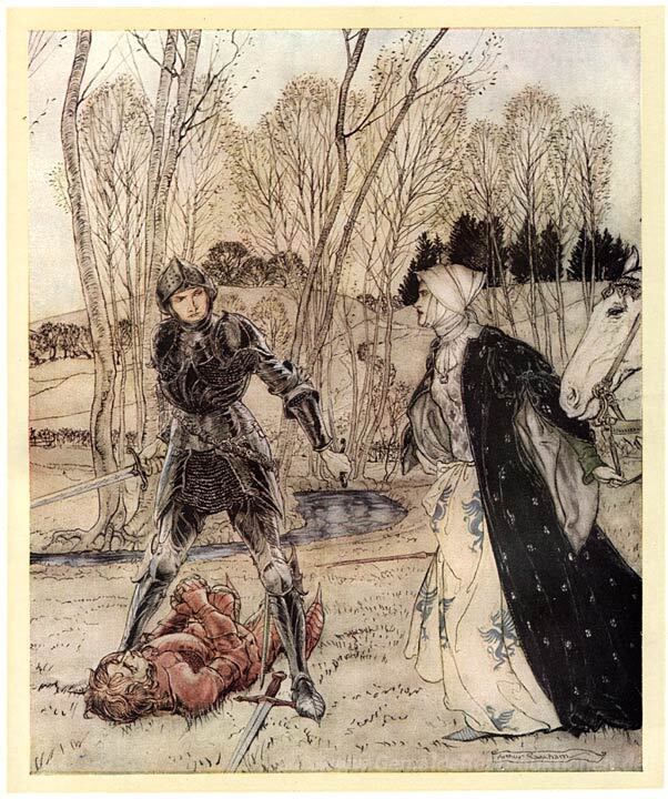 Wir bieten Ihnen eine handgefertigte Reproduktion auf Leinwand des berühmten Kunstwerks 'Sir Lancelot und Sir Balin' von Arthur Rackham, aus dem Reproduktionsmuseum.