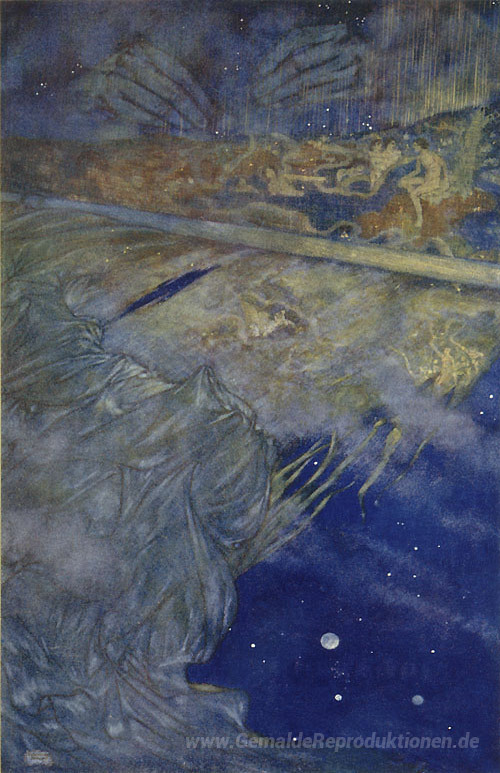 Wir bieten Ihnen eine handgefertigte Reproduktion auf Leinwand des berühmten Kunstwerks 'Solche Sachen wie Träume sind auf - von The Tempest' von Edmund Dulac, aus dem Reproduktionsmuseum.