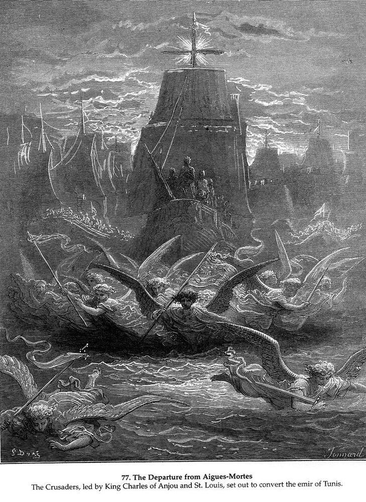 Wir bieten Ihnen eine handgefertigte Reproduktion auf Leinwand des berühmten Kunstwerks 'St. Louis verlassen Aigues-Mortes' von Gustave Dore, aus dem Reproduktionsmuseum.