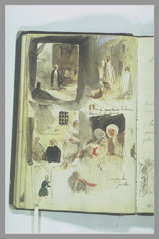 Wir bieten Ihnen eine handgefertigte Reproduktion auf Leinwand des berühmten Kunstwerks 'Straßen und Geschäfte mit Figuren, handschriftliche Notizen' von Eugene Delacroix, aus dem Reproduktionsmuseum.