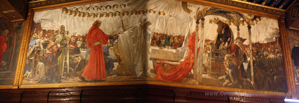 Wir bieten Ihnen eine handgefertigte Reproduktion auf Leinwand des berühmten Kunstwerks 'Suche nach dem Heiligen Gral' von Edwin Austin Abbey, aus dem Reproduktionsmuseum.