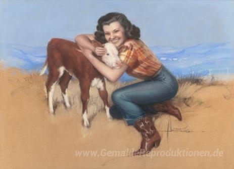 Wir bieten Ihnen eine handgefertigte Reproduktion auf Leinwand des berühmten Kunstwerks 'Take It Easy (Teil von Armstrongs Cowgirl-Serie)' von Rolf Amstrong, aus dem Reproduktionsmuseum.