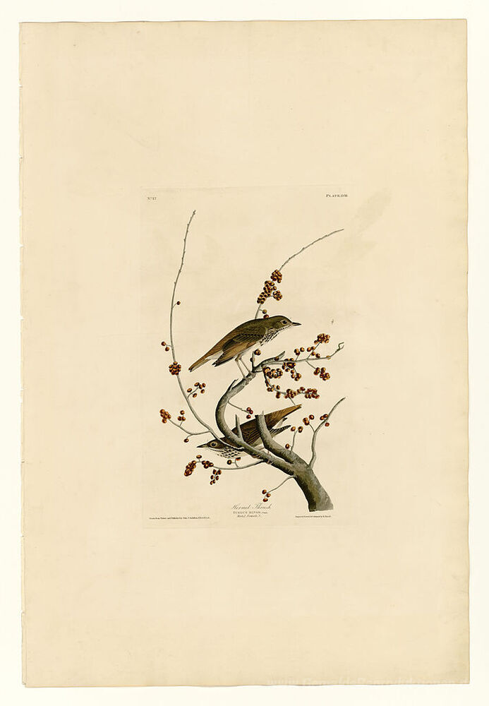 Wir bieten Ihnen eine handgefertigte Reproduktion auf Leinwand des berühmten Kunstwerks 'Teller 58.Hermit Thrush' von John James Audubon, aus dem Reproduktionsmuseum.