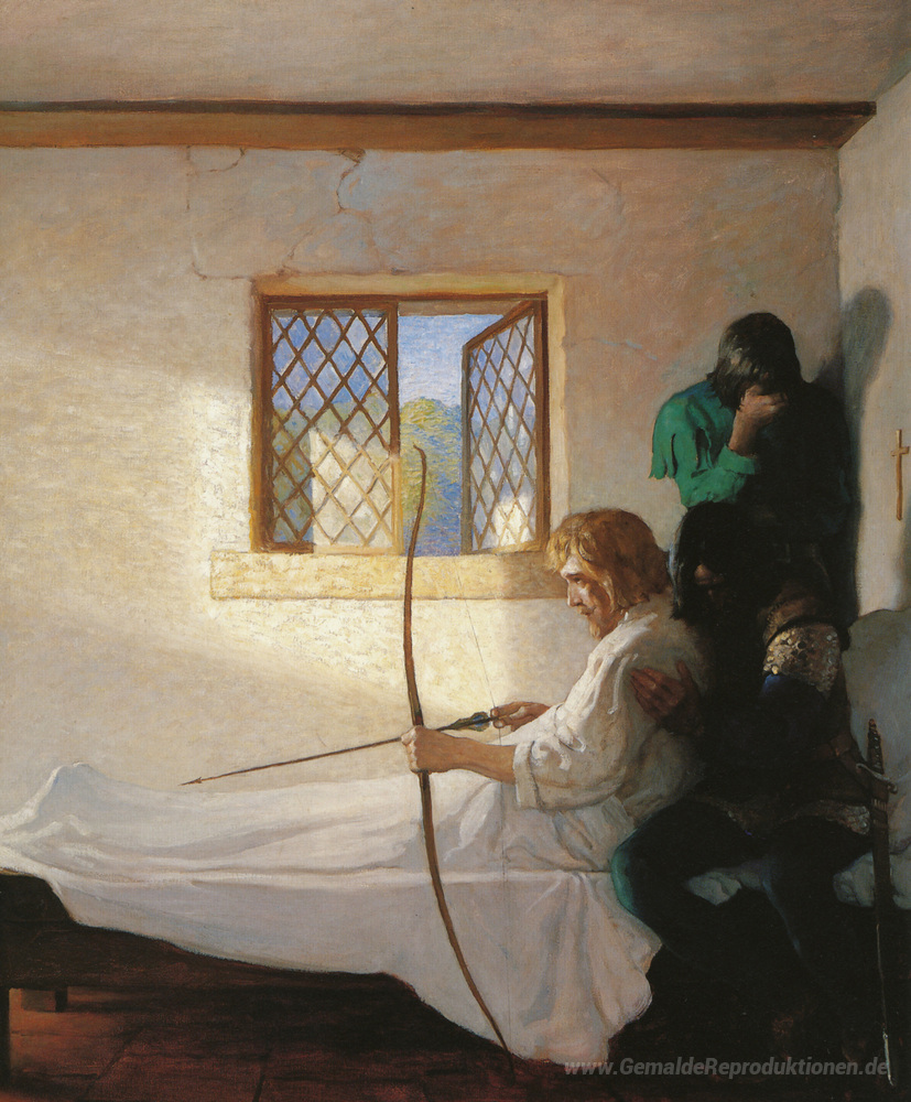 Wir bieten Ihnen eine handgefertigte Reproduktion auf Leinwand des berühmten Kunstwerks 'The Passing of Robin Hood' von N.C. Wyeth, aus dem Reproduktionsmuseum.