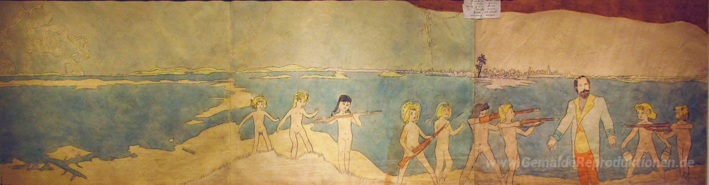 Wir bieten Ihnen eine handgefertigte Reproduktion auf Leinwand des berühmten Kunstwerks 'Trotz Ausbruch neuer Stürme ...' von Henry Darger, aus dem Reproduktionsmuseum.