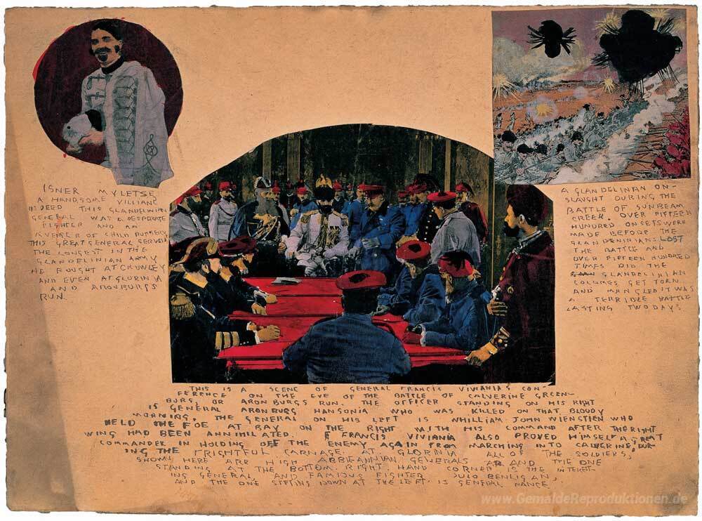 Wir bieten Ihnen eine handgefertigte Reproduktion auf Leinwand des berühmten Kunstwerks 'Untitled (Porträts von Glandelinian und Hoch Abbieannian Generäl' von Henry Darger, aus dem Reproduktionsmuseum.