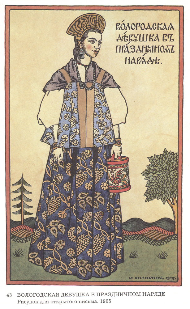 Wir bieten Ihnen eine handgefertigte Reproduktion auf Leinwand des berühmten Kunstwerks 'Vologda Mädchen im Feiertagskleid' von Ivan Bilibin, aus dem Reproduktionsmuseum.