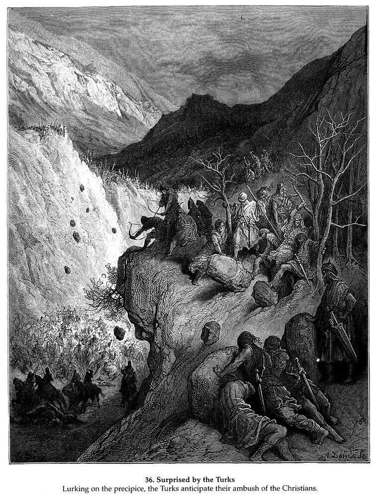 Wir bieten Ihnen eine handgefertigte Reproduktion auf Leinwand des berühmten Kunstwerks 'Von den Türken überrascht' von Gustave Dore, aus dem Reproduktionsmuseum.