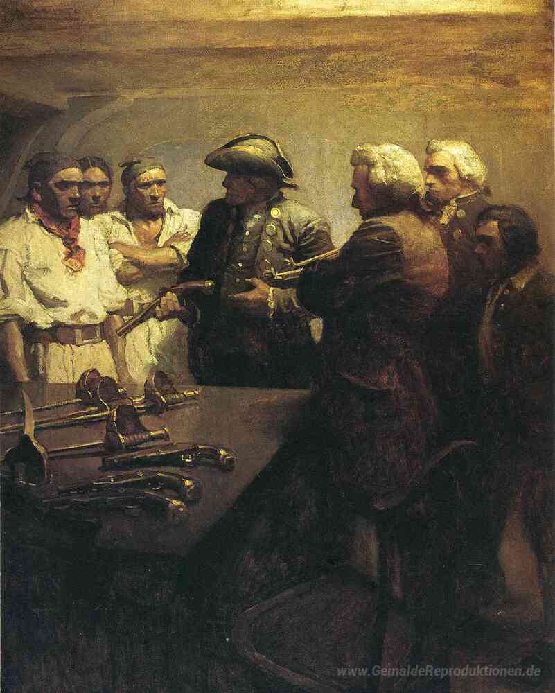 Wir bieten Ihnen eine handgefertigte Reproduktion auf Leinwand des berühmten Kunstwerks 'Vorbereitung für Mutiny' von N.C. Wyeth, aus dem Reproduktionsmuseum.