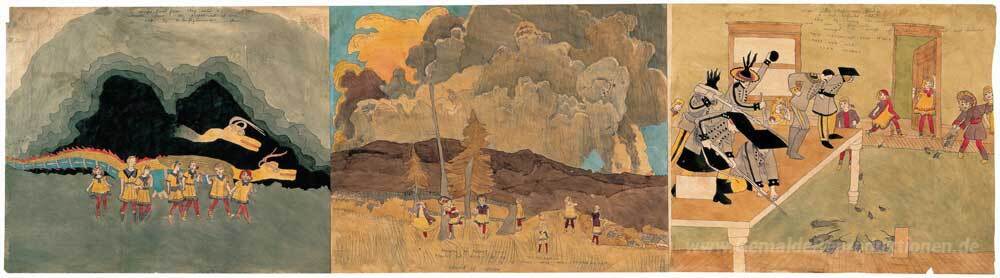 Wir bieten Ihnen eine handgefertigte Reproduktion auf Leinwand des berühmten Kunstwerks 'Waldbrände zu entkommen sie einen vulkanischen Höhle betreten' von Henry Darger, aus dem Reproduktionsmuseum.