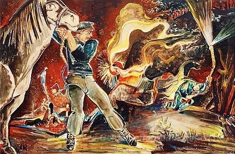 Wir bieten Ihnen eine handgefertigte Reproduktion auf Leinwand des berühmten Kunstwerks 'Ausbruch von Feuer' von Gosta Adrian-Nilsson, aus dem Reproduktionsmuseum.