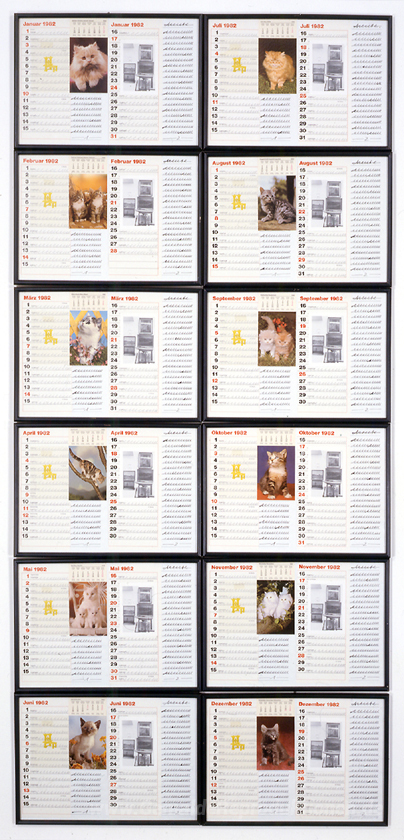 Wir bieten Ihnen eine handgefertigte Reproduktion auf Leinwand des berühmten Kunstwerks '12 Monate mit Postkarten Von heute von Kittens' von Hanne Darboven, aus dem Reproduktionsmuseum.
