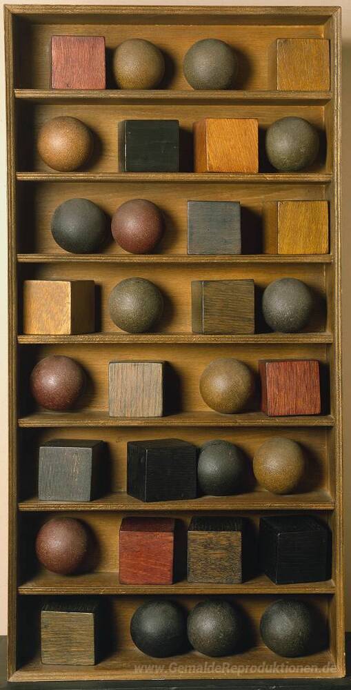 Wir bieten Ihnen eine handgefertigte Reproduktion auf Leinwand des berühmten Kunstwerks '16 Bälle, 16 Würfel in 8 Zeilen' von Pol Bury, aus dem Reproduktionsmuseum.