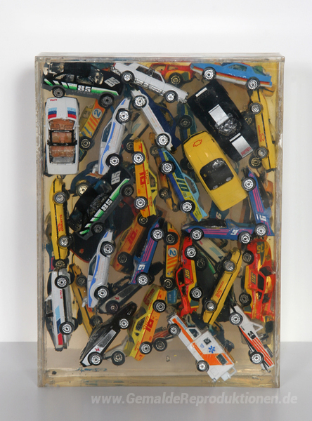 Wir bieten Ihnen eine handgefertigte Reproduktion auf Leinwand des berühmten Kunstwerks 'Auto Accumulation (Matchbox-Autos)' von Arman, aus dem Reproduktionsmuseum.