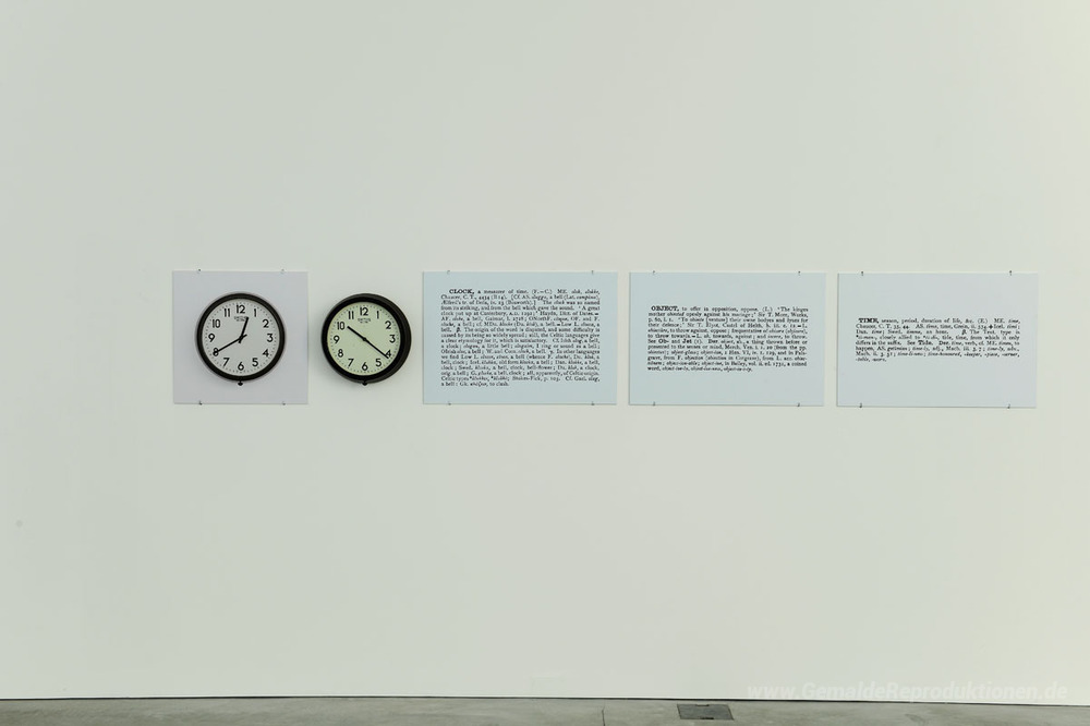 Wir bieten Ihnen eine handgefertigte Reproduktion auf Leinwand des berühmten Kunstwerks 'Clock (ein bis fünf)' von Joseph Kosuth, aus dem Reproduktionsmuseum.